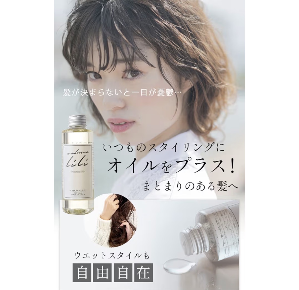 髪が多くてもベタつかず、しっかりまとまるので気に入っています。ボトルもおしゃれで気分が上がります。